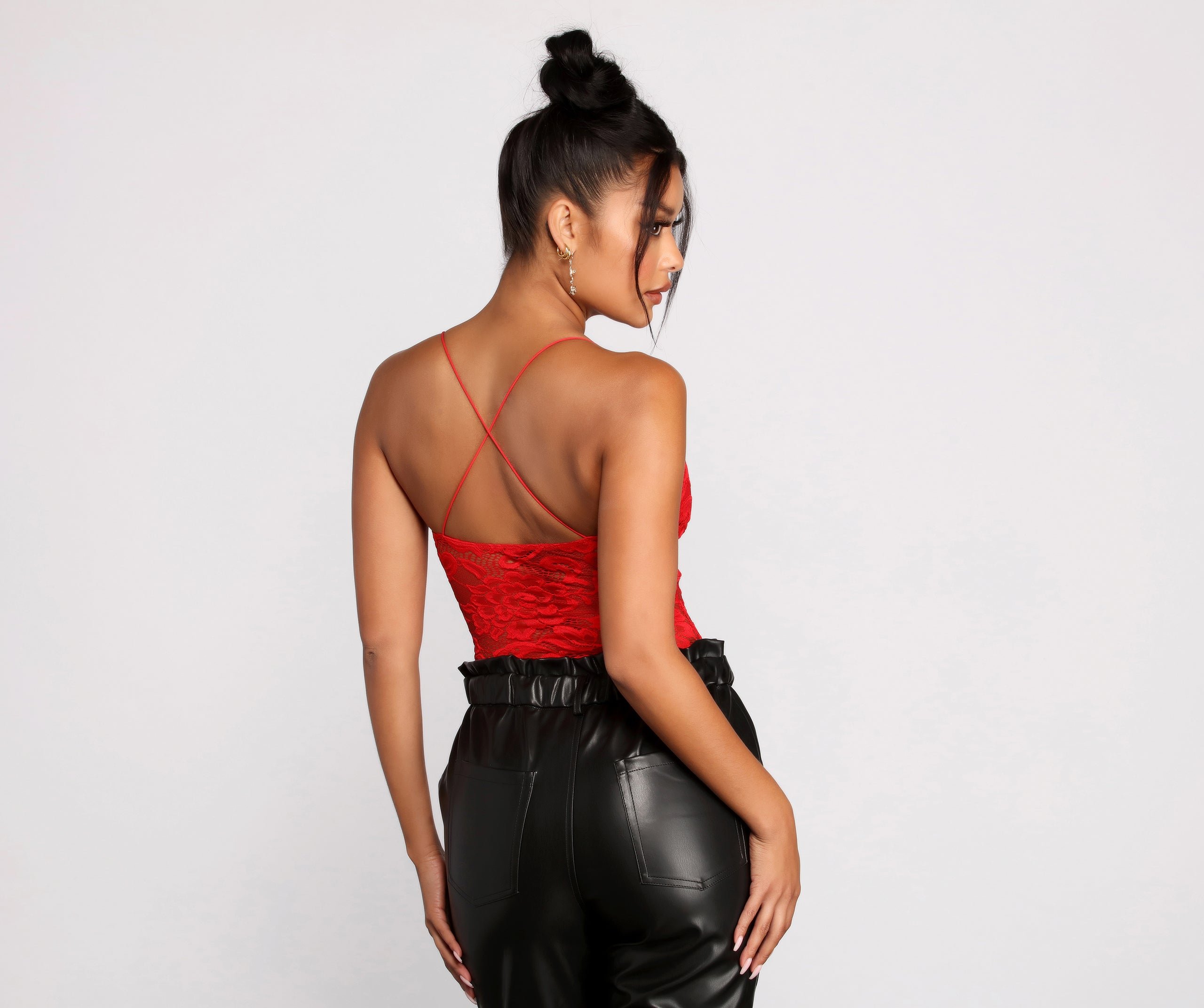 Sultry and chic will be your vibe in this sexy bodysuit! It features bungee spaghetti straps that lead to a cross back, a scoop neckline, and is composed of sheer lace fabric with a lining at the bust. Pair this form-fitting bodysuit with