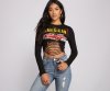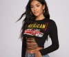 Edge up your everyday look with this trendy graphic crop top! It features long fitted sleeves, a cropped, form-fitting style, slashed front detailing, and a center car graphic with the script "The American Classic." Pair this tee with