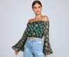 Show off your passion for pretty florals with this romantic top! The top features an off-the-shoulder neckline, long bell sleeves, a cropped hem, and a floral print. The top is composed of a lined chiffon fabric that offers a form hugging fit with minimal stretch. Complete look with a