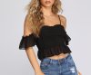 Get that perfect 'fit with this trendy ruched crop top! It features a slight sweetheart neckline, adjustable spaghetti straps, short, fluttery ruffle sleeves, a ruched front detail, a stretchy smocked back, and a ruffle, cropped hem. The top is composed of a sheer, lightweight mesh fabric with a front lining.