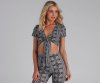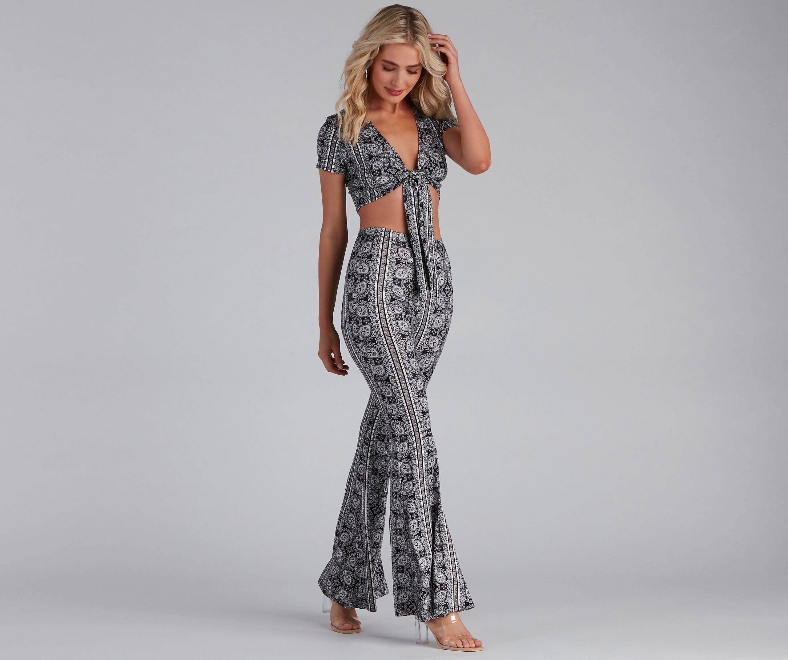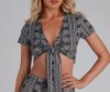 You'll be such a boho bae in this paisley crop top perf for the music festival season! It features cap sleeves, a plunge v-neckline, and a flirty tie-front along the cropped hem. Style with the matching bottoms.
