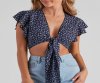 You'll look oh-so-darling in this ditsy floral printed top! It features short flutter sleeves, a V-neckline, a tie-front design, and a cropped fit. Style with