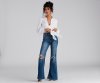 It's the sultry appeal. This tie-front collared top is perfect for dressing up your jeans. It features long bishop sleeves with button cuffs, a plunge V-neckline, and a cropped hem. Complete the look with a chic